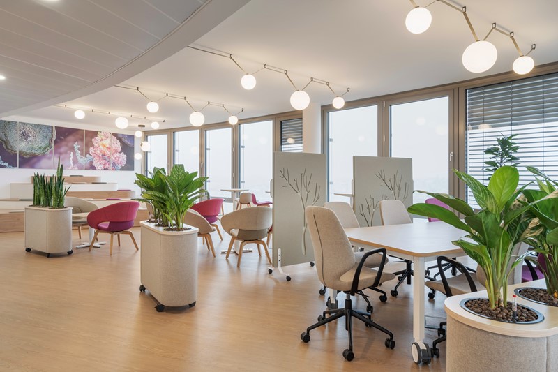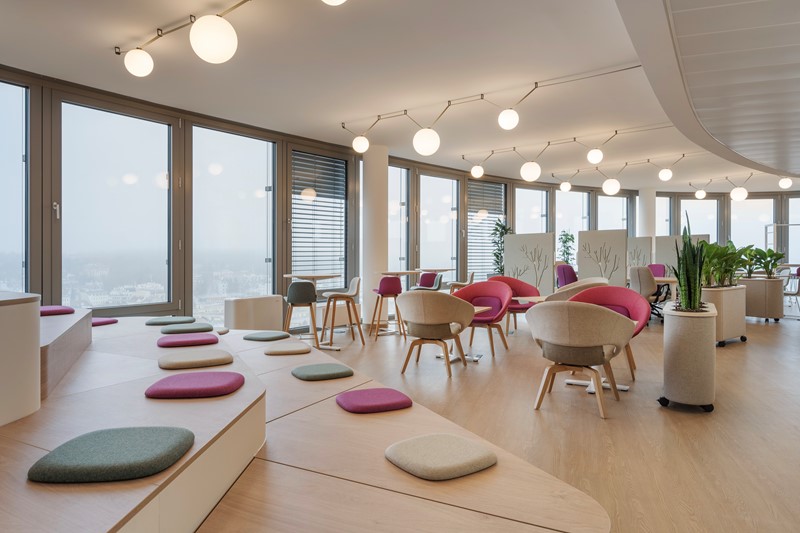ProduktHjärtat på kontoret är "Lounge Deck 5", en 75 kvadratmeter stor kommunikationsyta med kafé. Här kan de anställda mötas för en kaffe eller ta sin lunchrast. En generös Nonstop-soffa ger gott om möjligheter för att chatta, läsa eller bara titta ut genom de stora panoramafönsterna. Varma naturliga toner på klädseln skapar en inbjudande atmosfär.